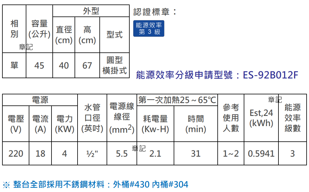 電光牌(TENCO)12加侖電能熱水器(橫掛式) ES-92B012F 全機不鏽鋼(外部#430、內桶#304) 數量