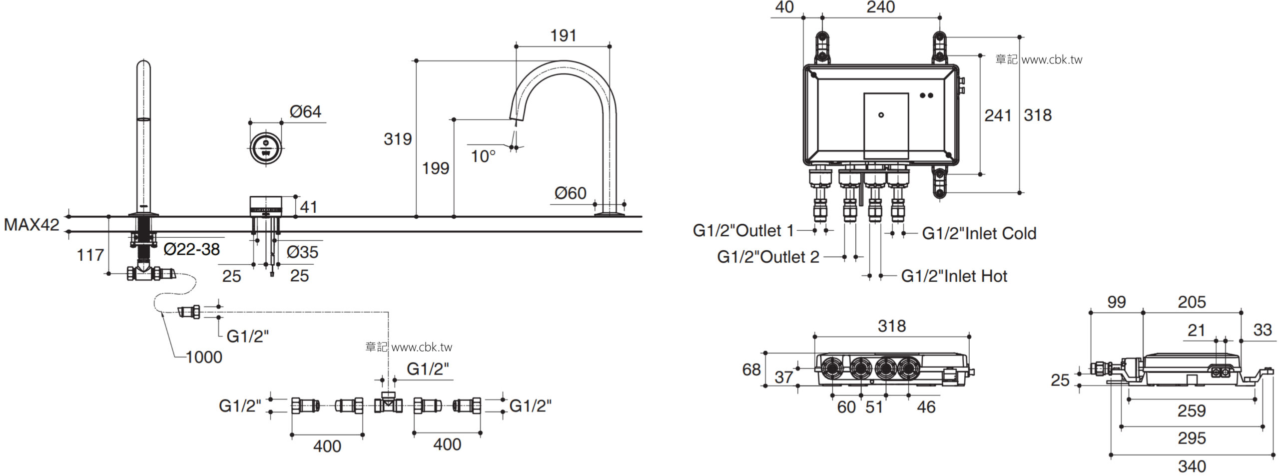 KOHLER DTV MODE 缸邊式浴缸龍頭組合(鉻) K-22329T-7-CP_K-23773T-NA 尺寸圖