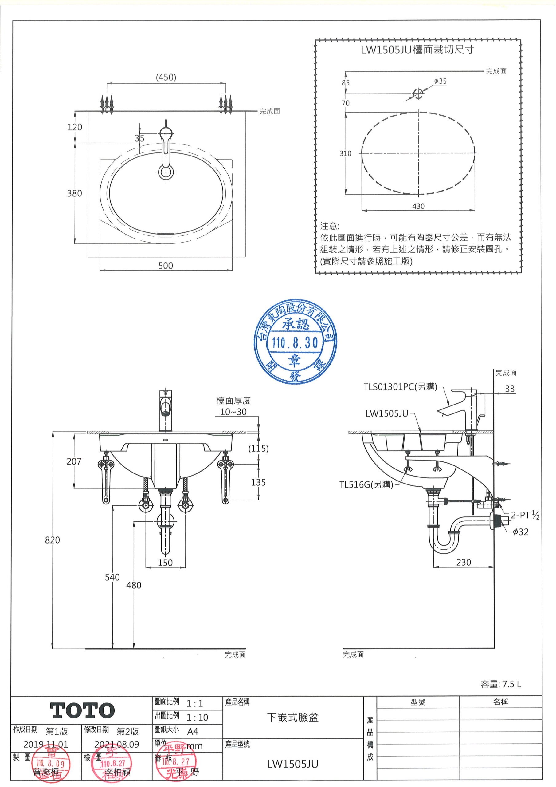 TOTO LW1505JU 下嵌式臉盆 數量