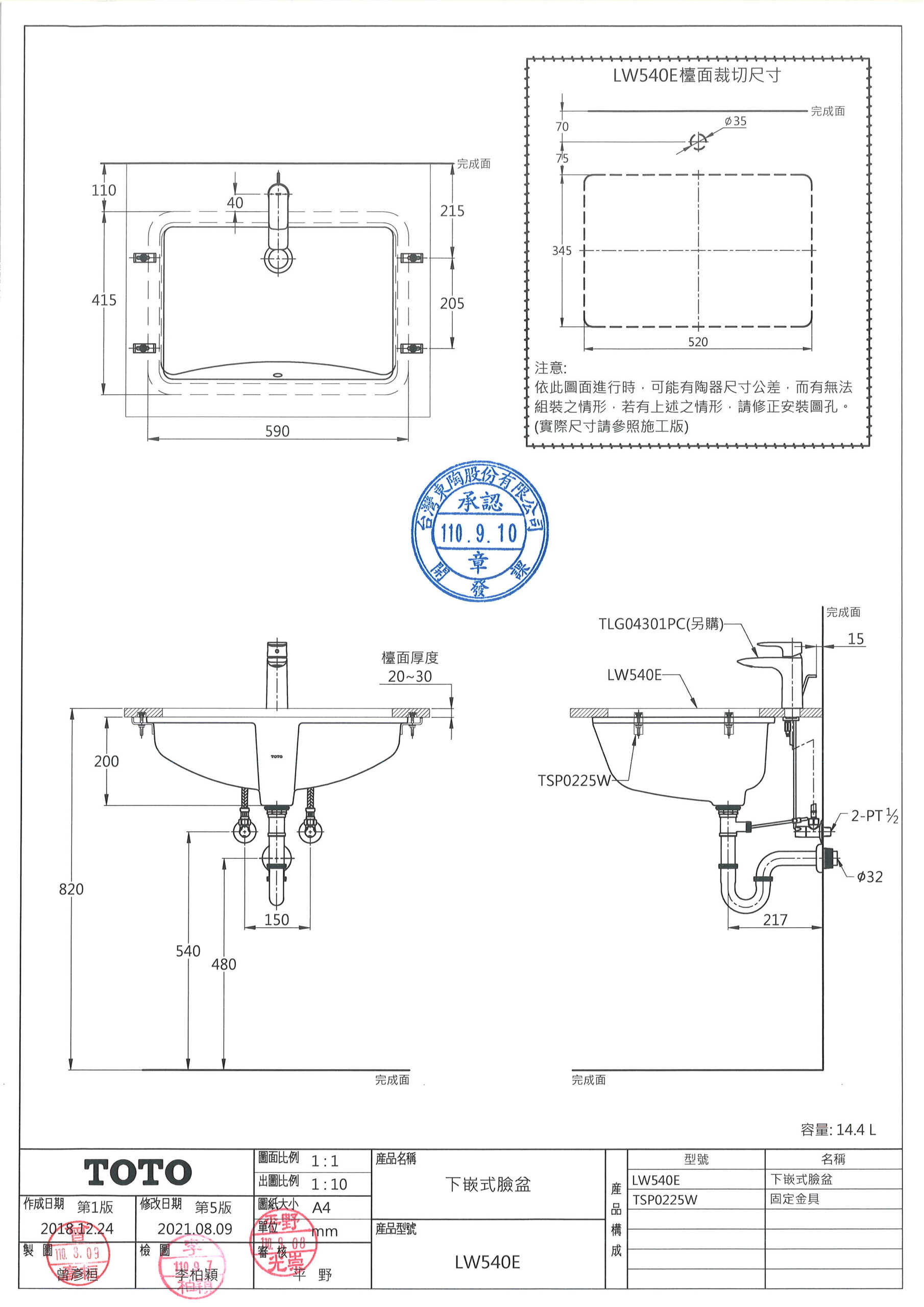 TOTO LW540E 下嵌式臉盆 數量