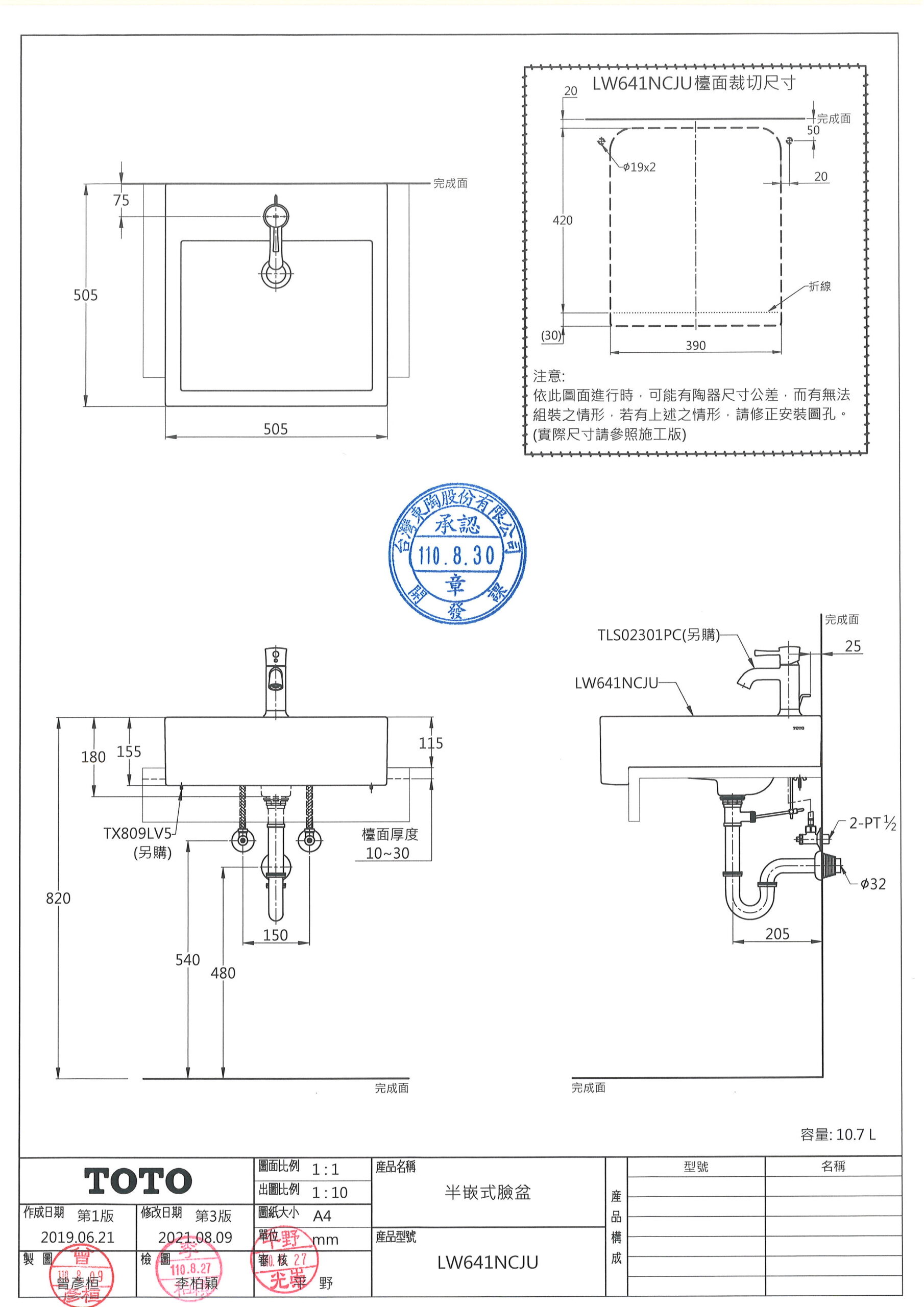 TOTO LW641NCJU 半嵌式臉盆 數量