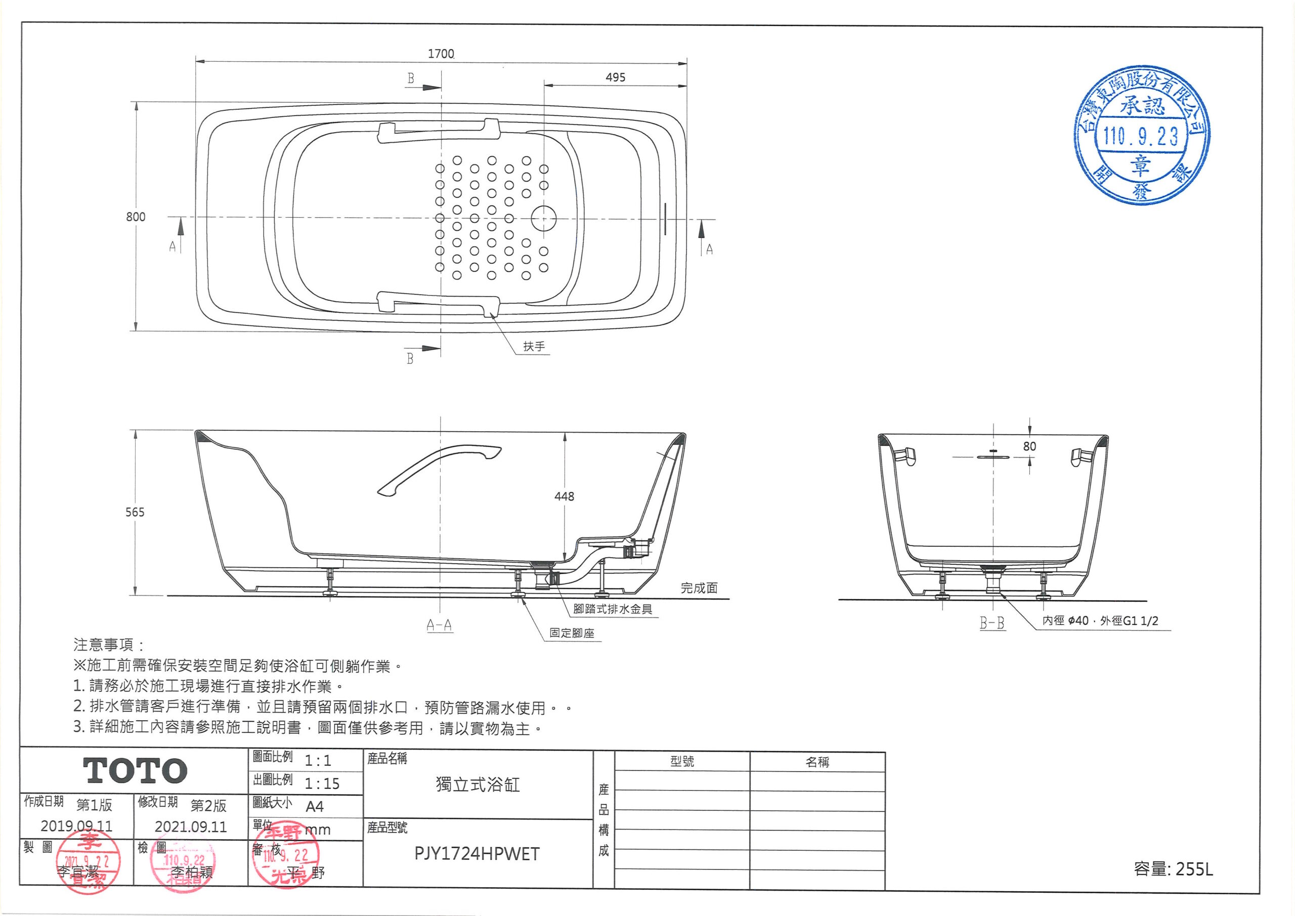 TOTO PJY1724HPWET#MW 獨立式浴缸