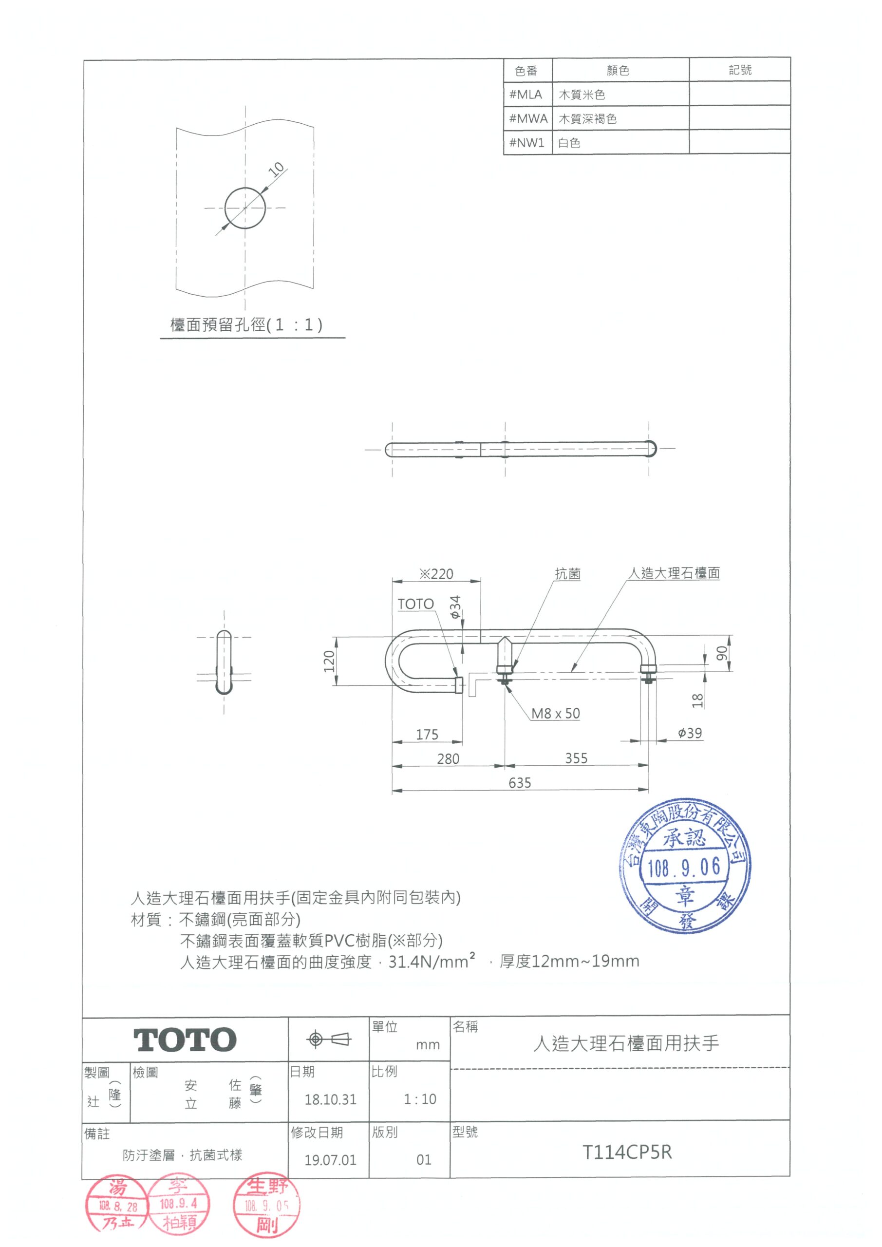TOTO T114CP5R 人造大理石檯面用扶手 數量