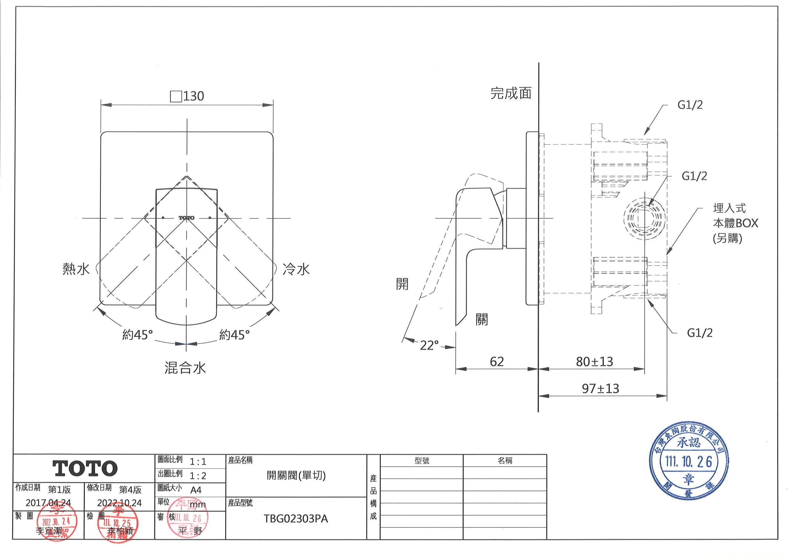 TOTO TBG02303PA GR開關閥(單切) 數量