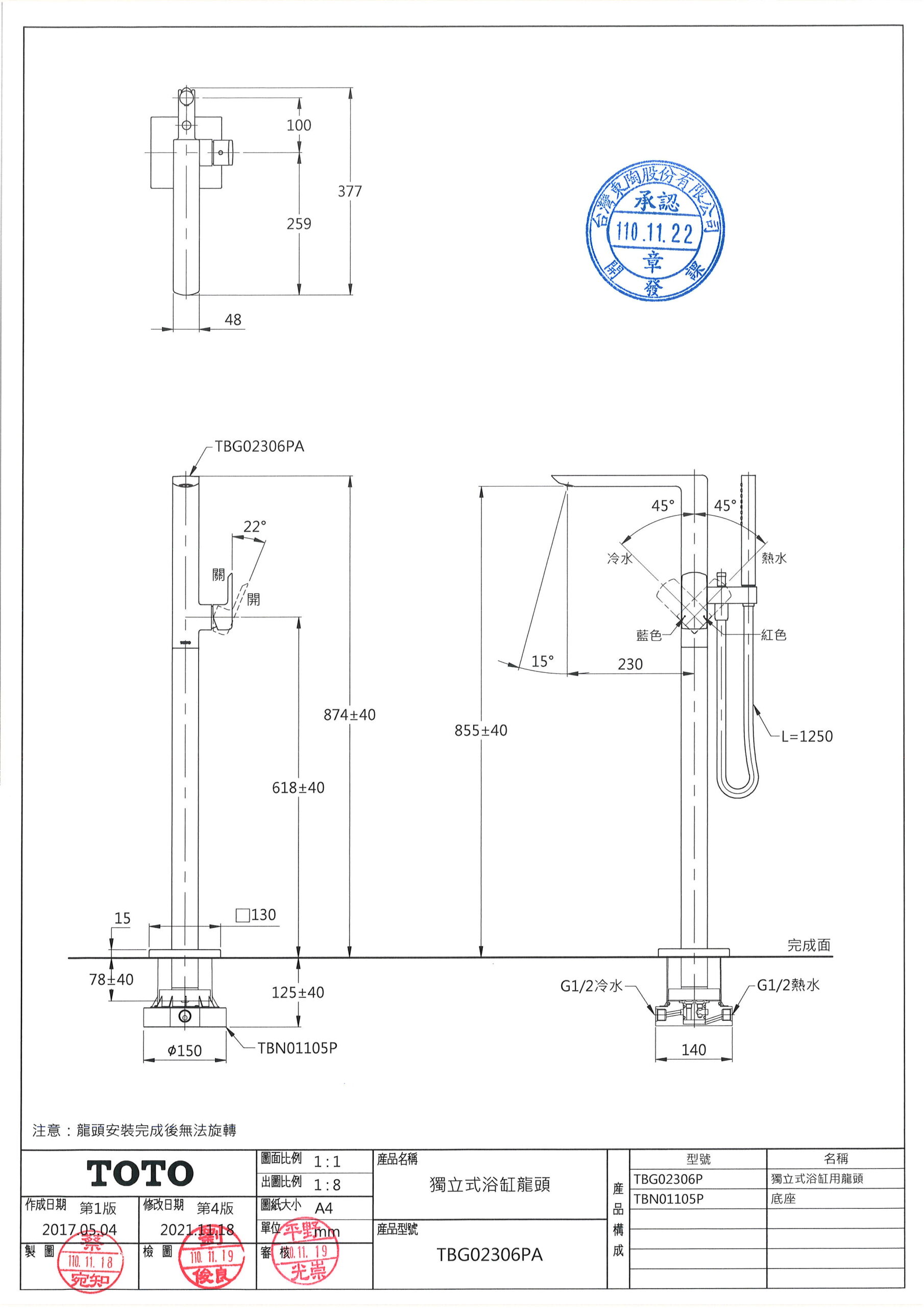 TOTO TBG02306PA 獨立式浴缸用龍頭