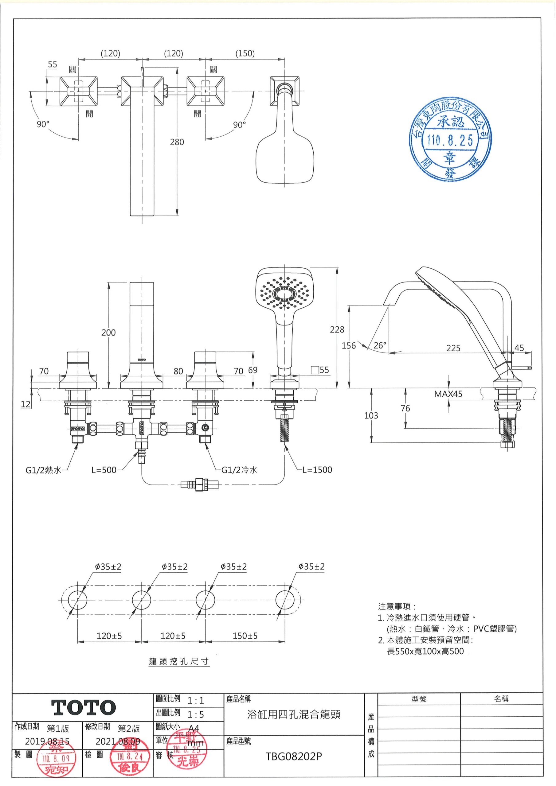 TOTO TBG08202P 浴缸用四孔混合龍頭 數量