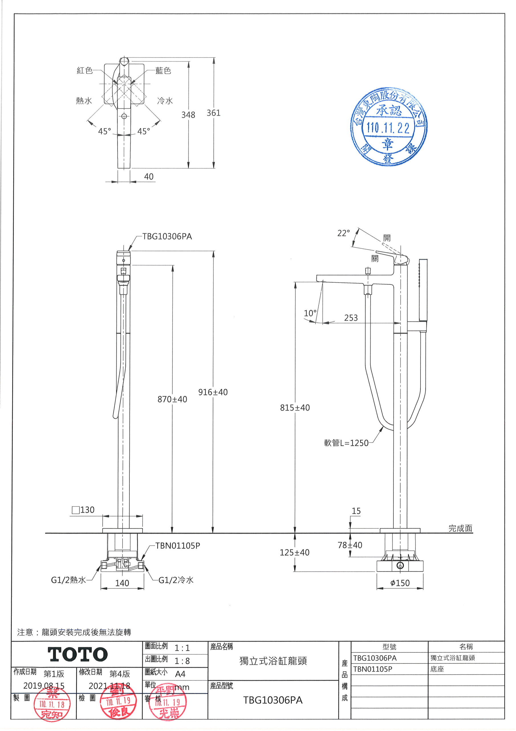 TOTO TBG10306PA 獨立式浴缸用龍頭