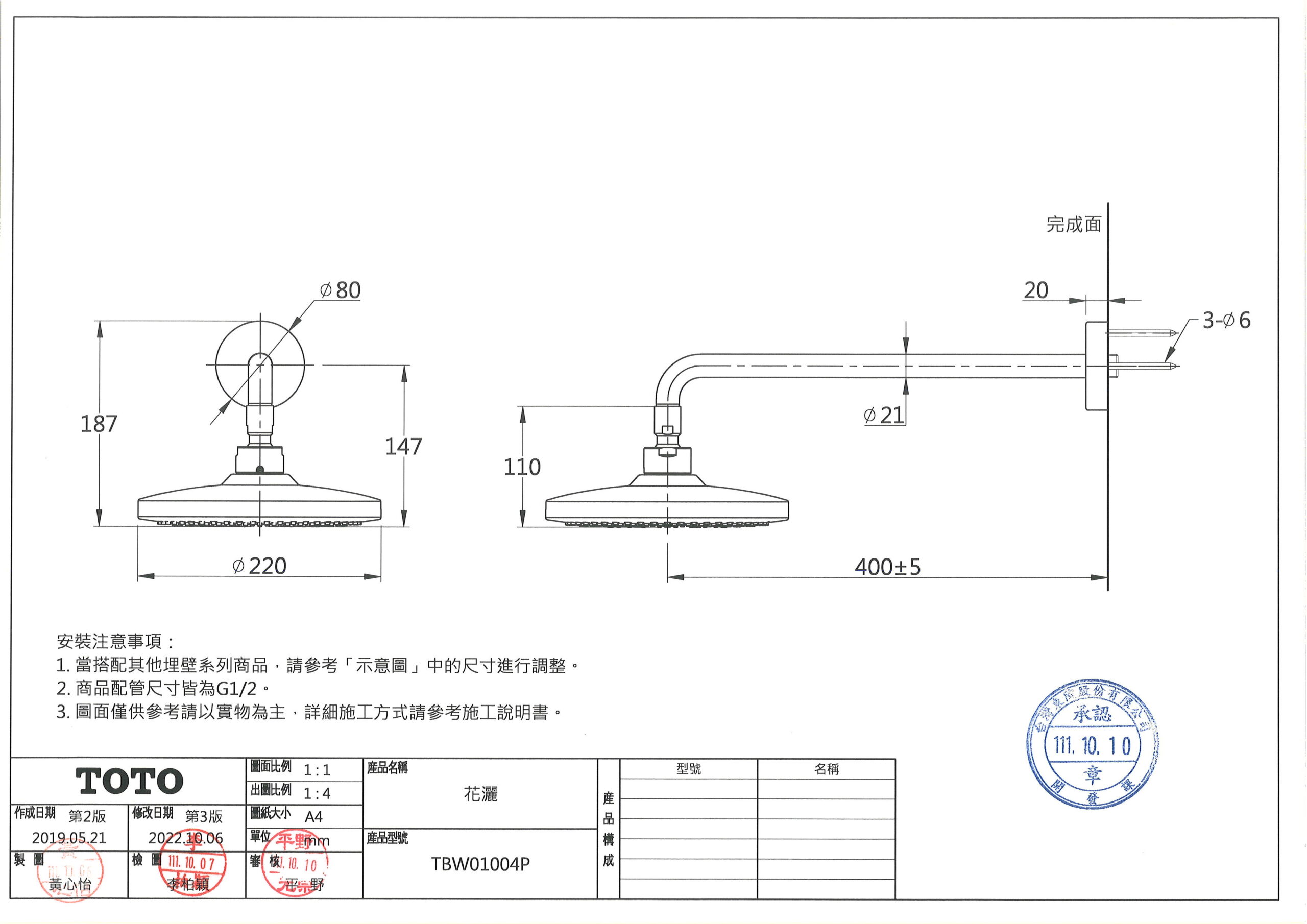 TOTO TBW01004P 220壁出式花灑 數量