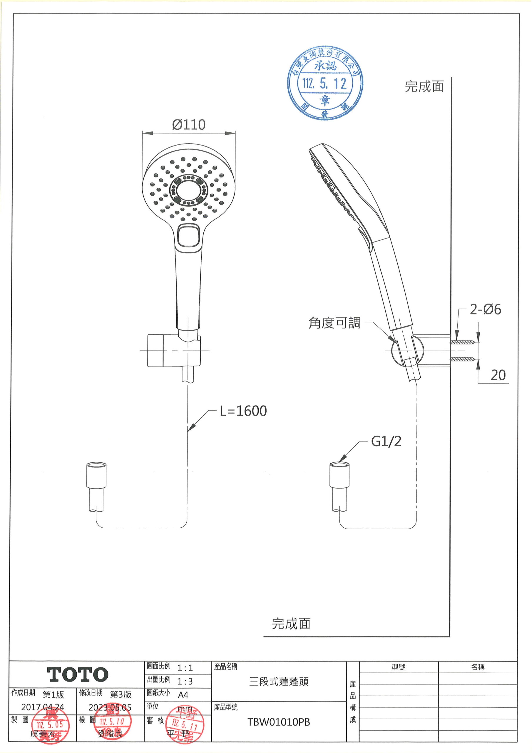 TOTO TBW01010PB 三段式蓮蓬頭