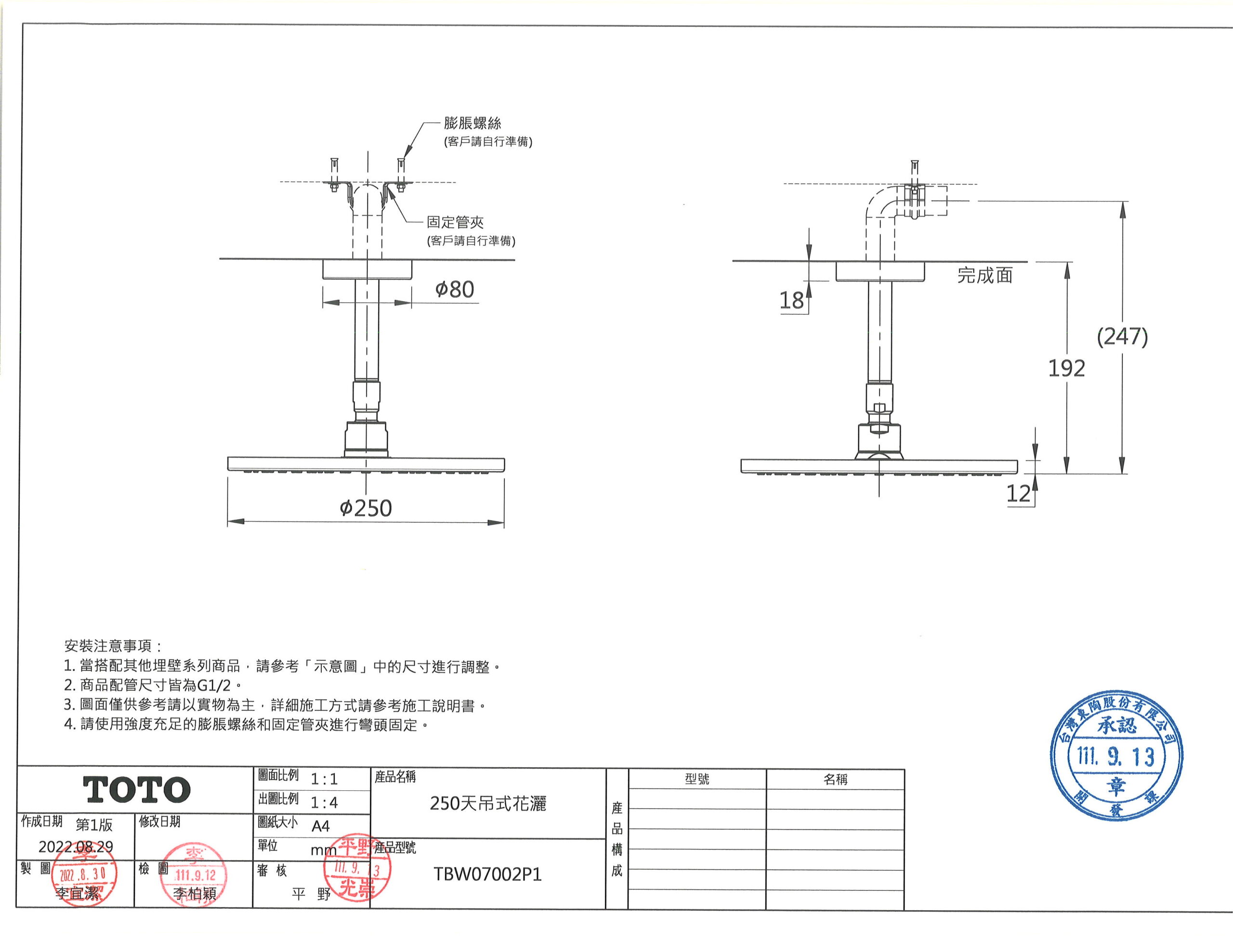TOTO TBW07002P1 250天吊式花灑 數量
