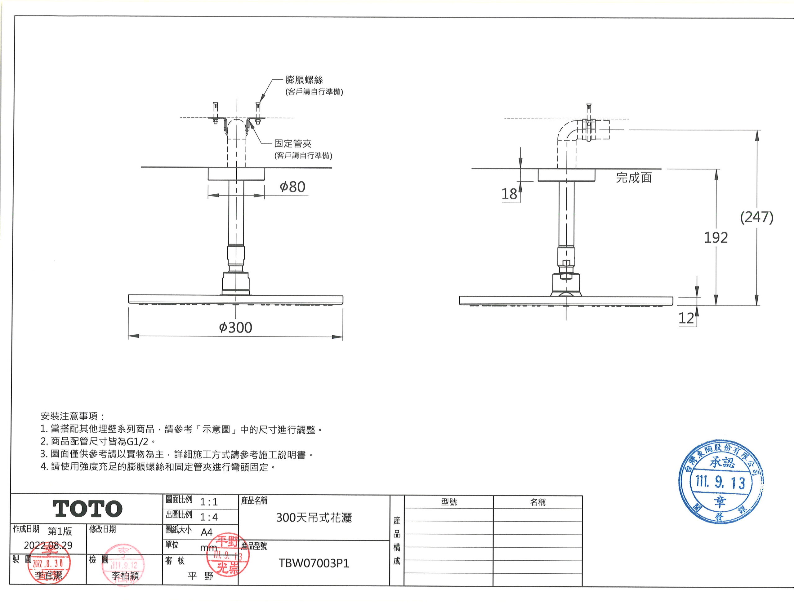 TOTO TBW07003P1 300天吊式花灑 數量