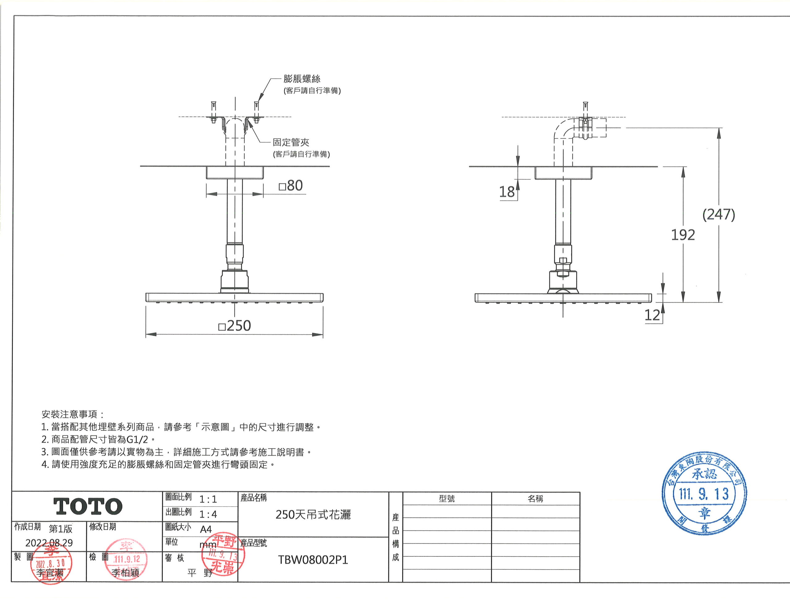 TOTO TBW08002P1 250天吊式花灑