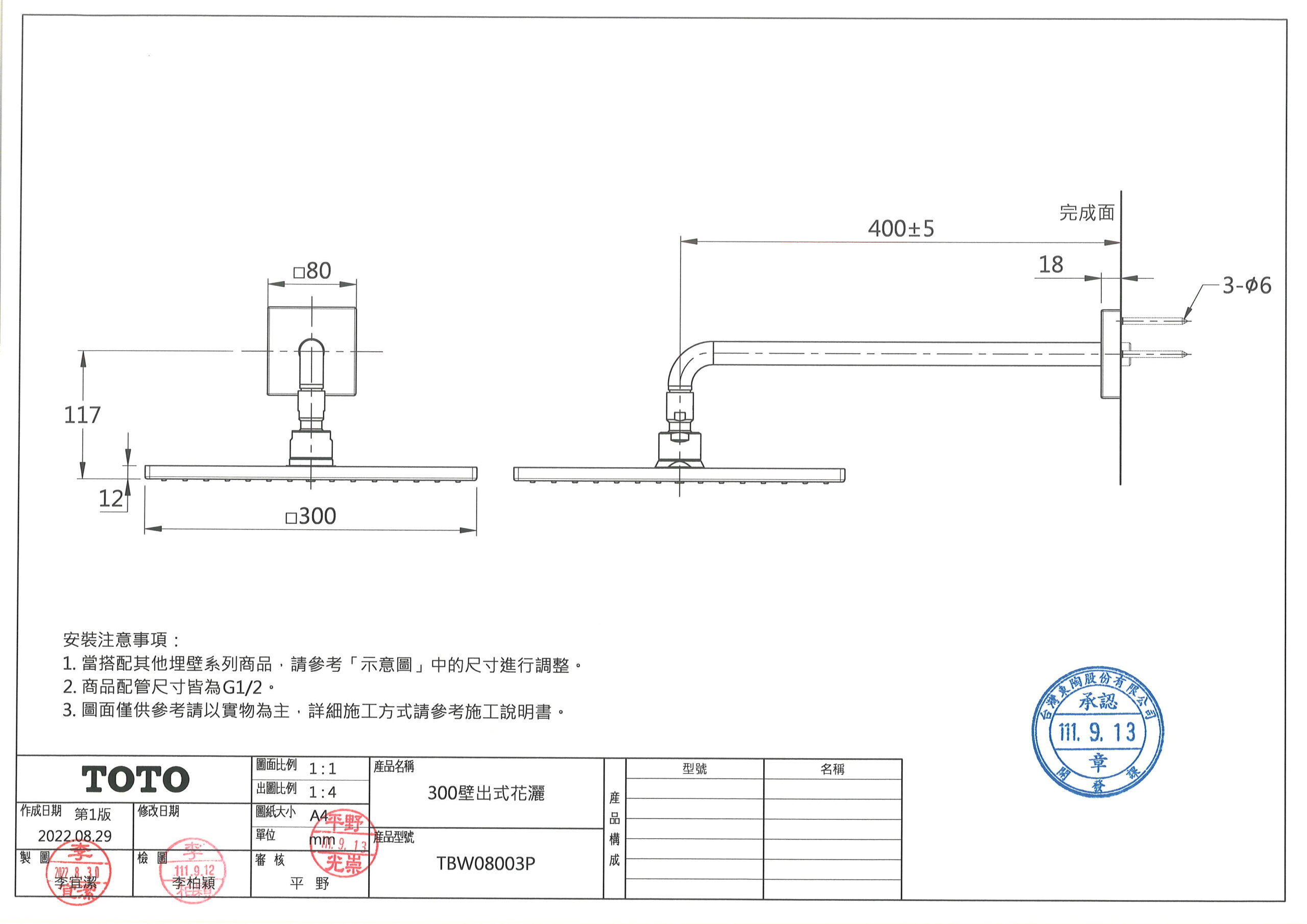 TOTO TBW08003P 300壁出式花灑 數量
