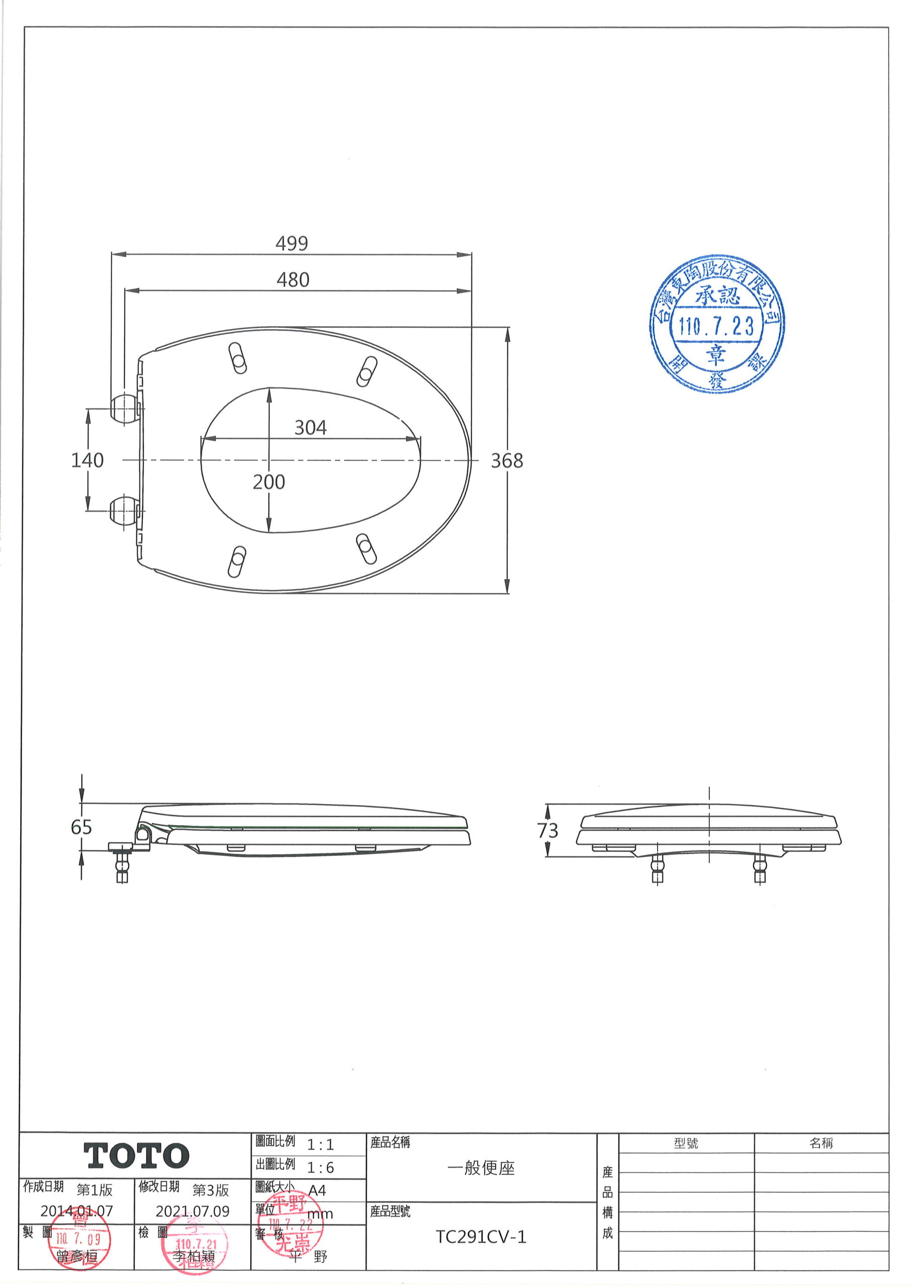TOTO 原廠馬桶蓋(下鎖式) TC291 尺寸圖