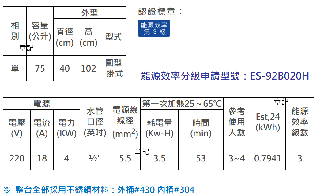 電光牌(TENCO)20加侖電能熱水器(直掛式) ES-92B020H 全機不鏽鋼(外部#430、內桶#304) 訂製品 數量