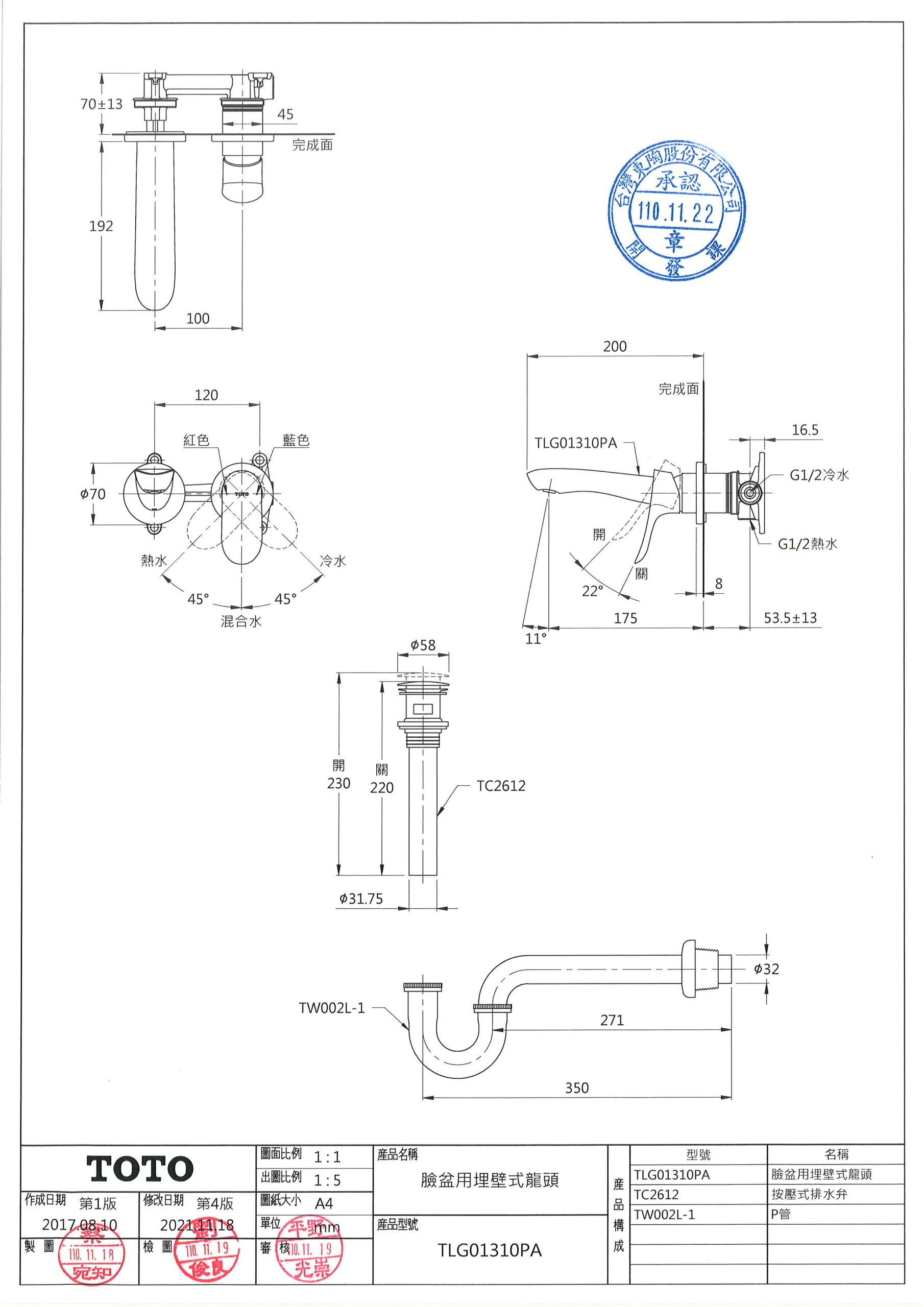 TOTO TLG01310PA 臉盆用埋壁式龍頭 (短) 數量