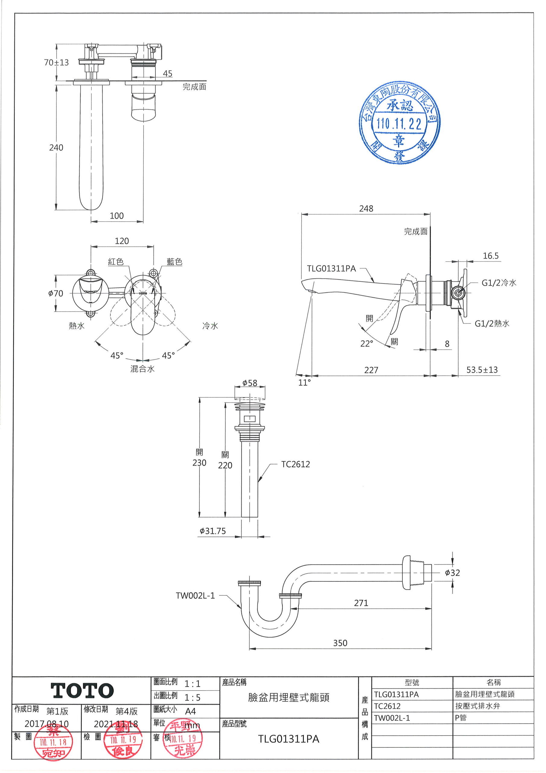 TOTO TLG01311PA 臉盆用埋壁式龍頭 (長) 數量
