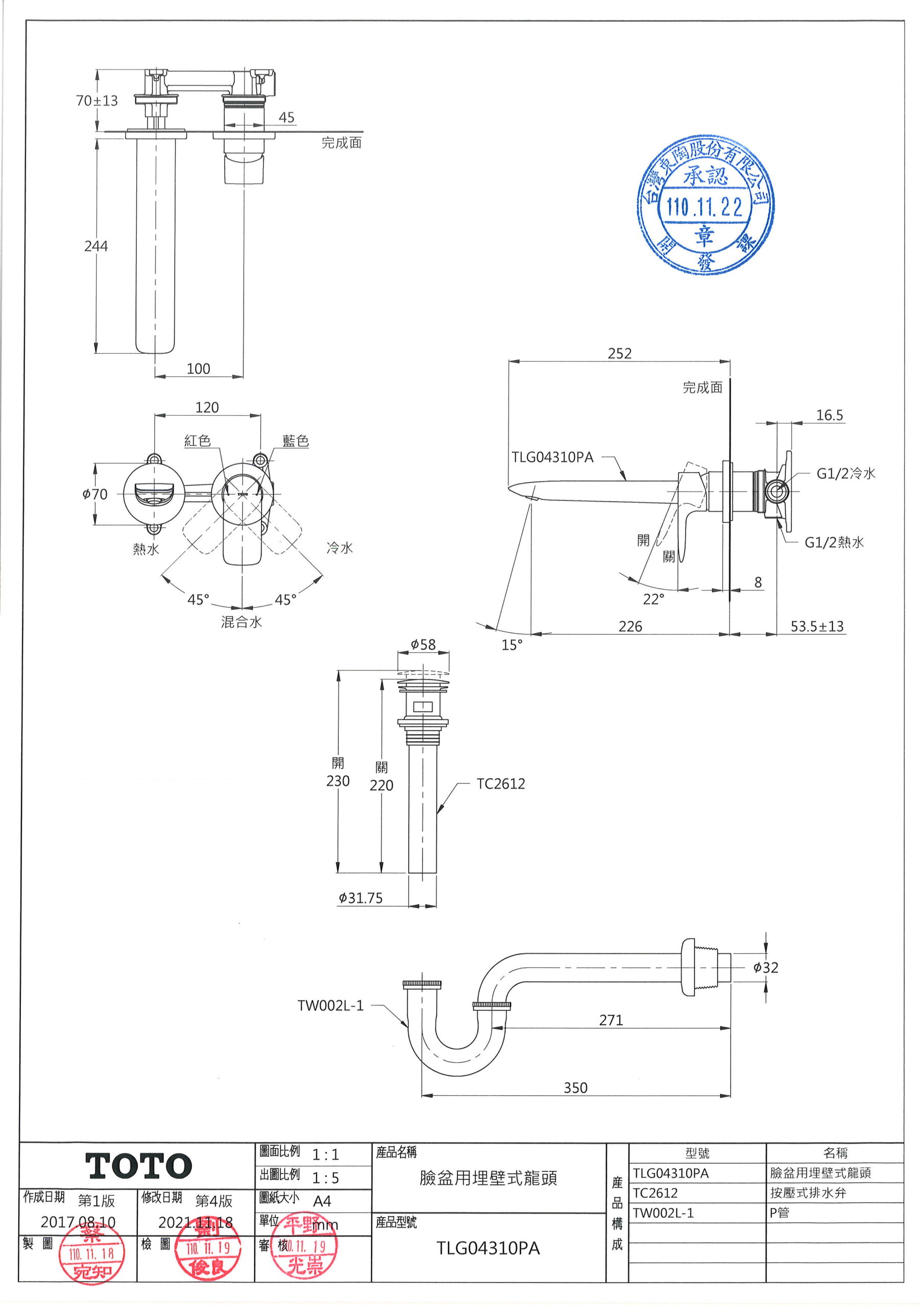 TOTO TLG04310PA 臉盆用埋壁式龍頭 (長) 數量
