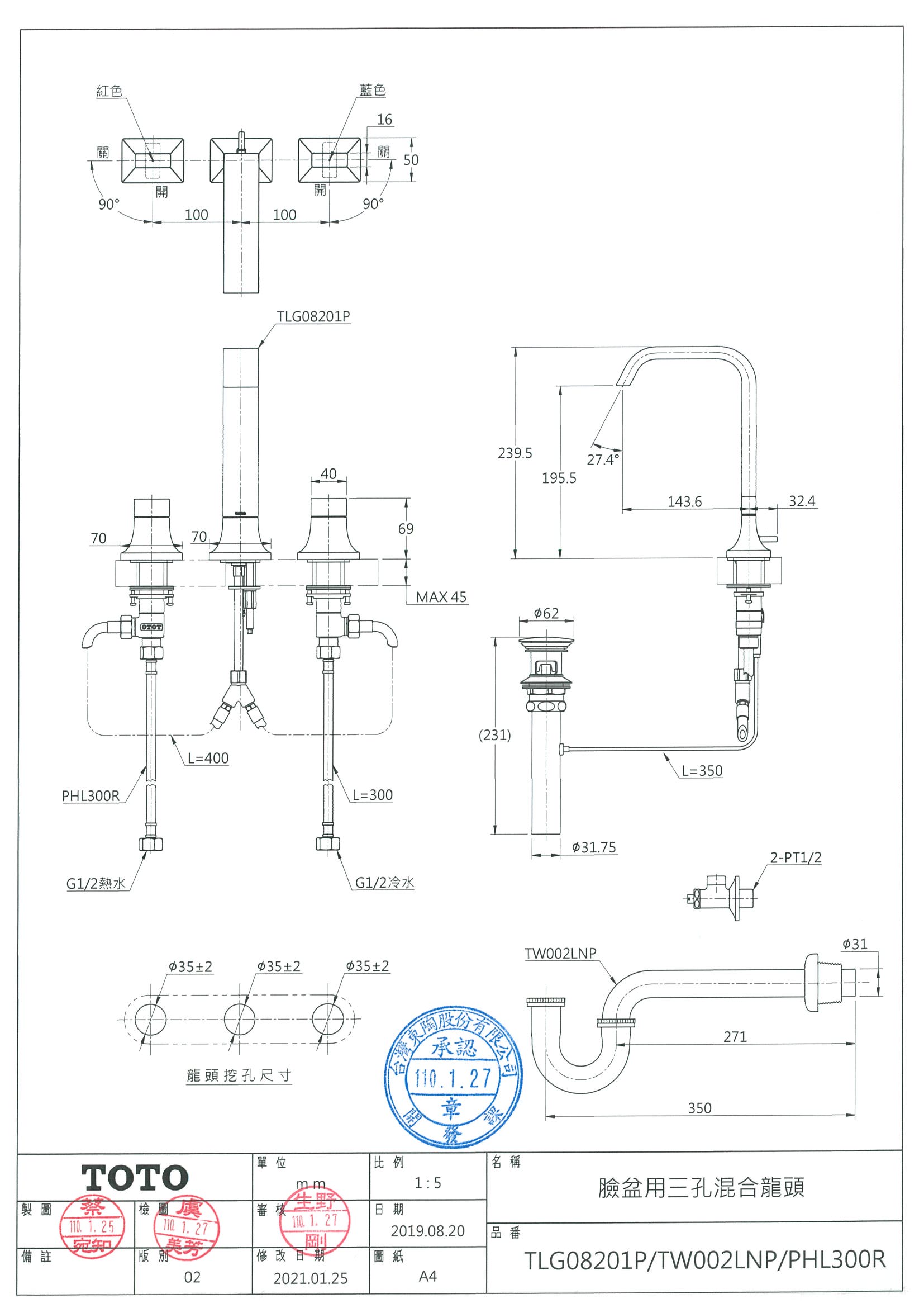 TOTO TLG08201P 臉盆用三孔混合龍頭